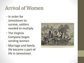Demographic Imbalance & Population Growth: Jamestown began as an almost exclusively male venture. High mortality rates from disease, malnutrition, and conflict further skewed the gender ratio. Without women, there was no possibility of natural population increase through births, dooming the colony to perpetual reliance on risky and expensive new immigration. Women were essential for creating families and raising children born in Virginia.